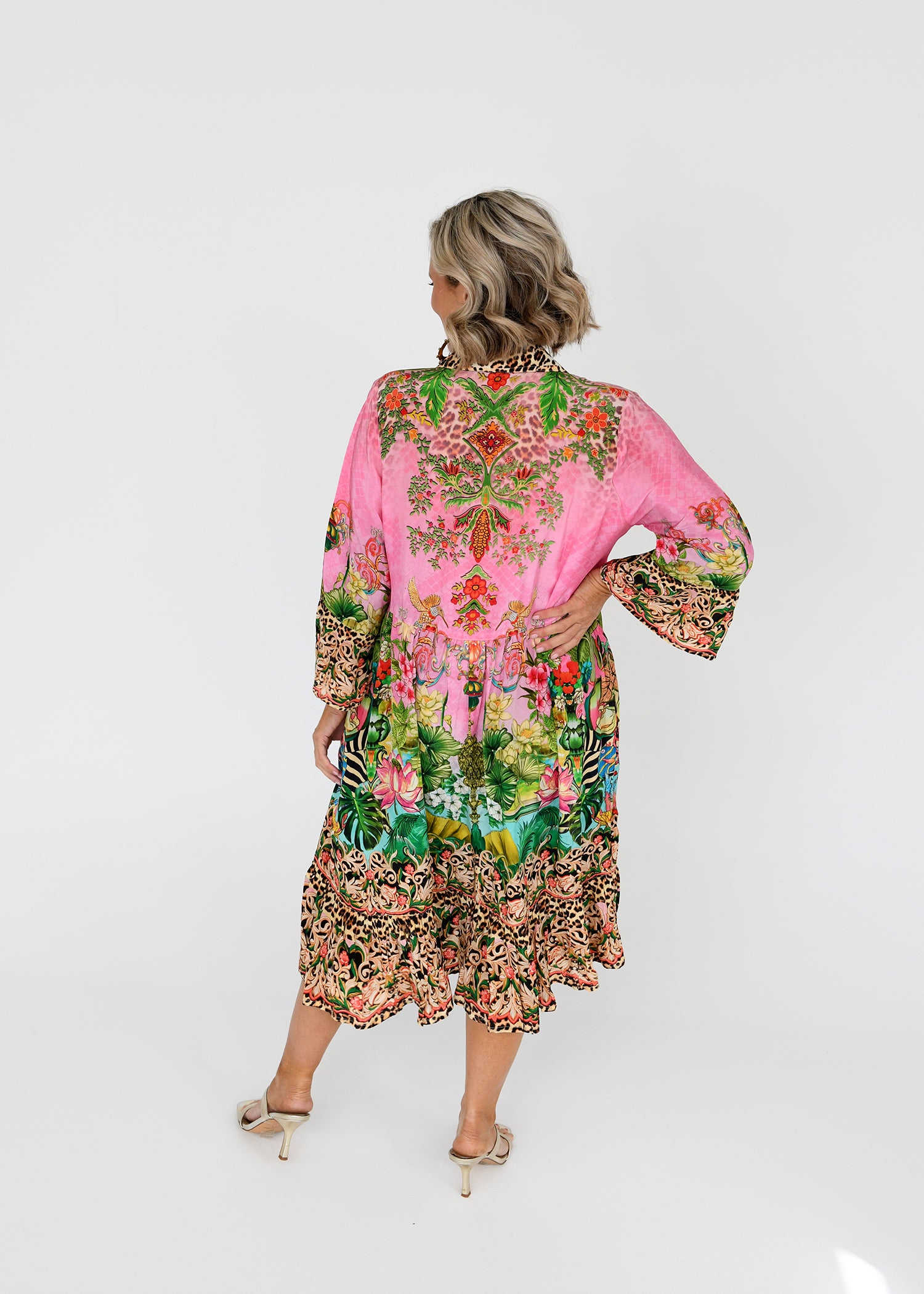 A bold, eclectic and vibrant knee-length dress that combines multiple exotic and tropical design elements for a statement look.