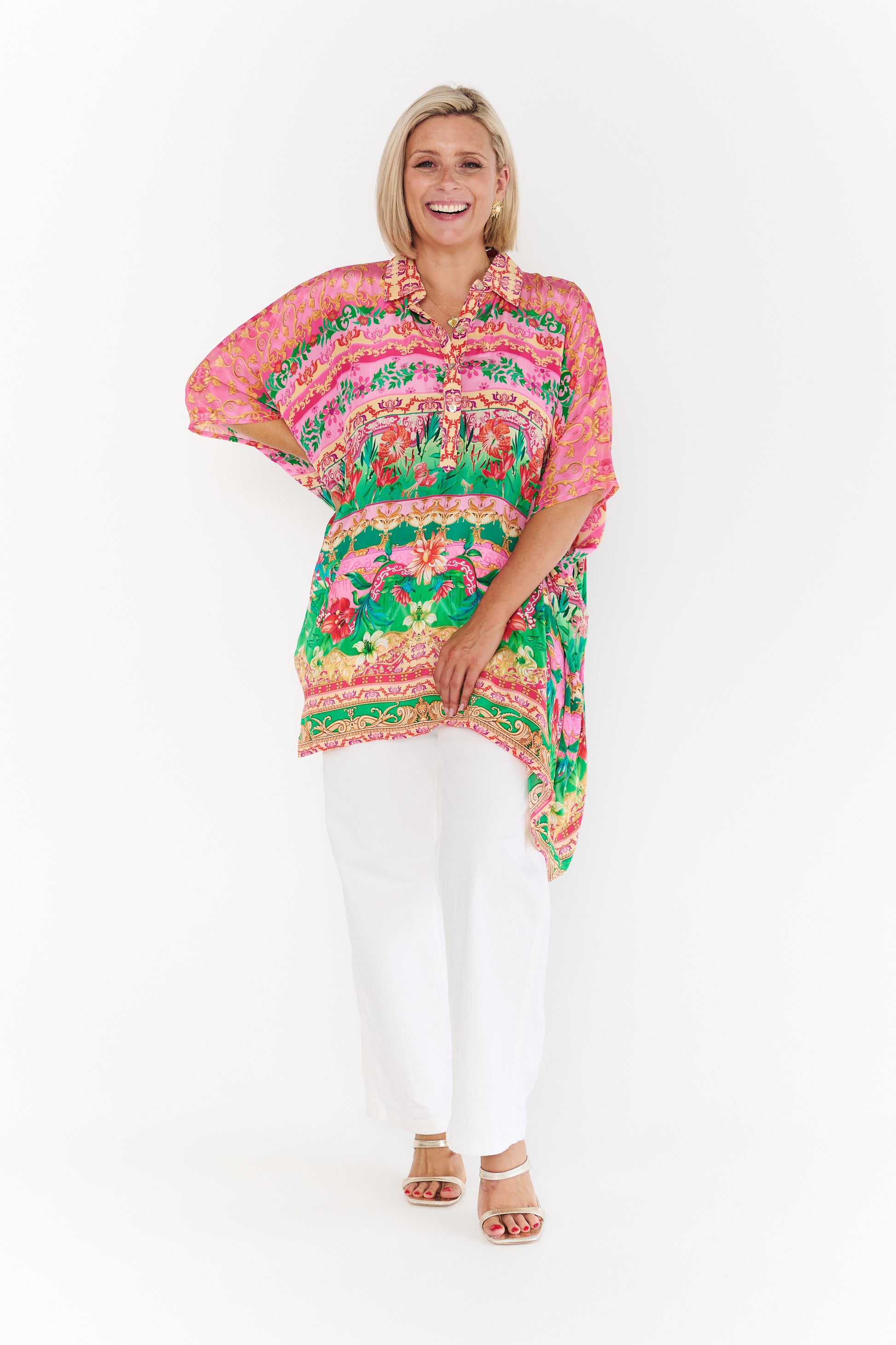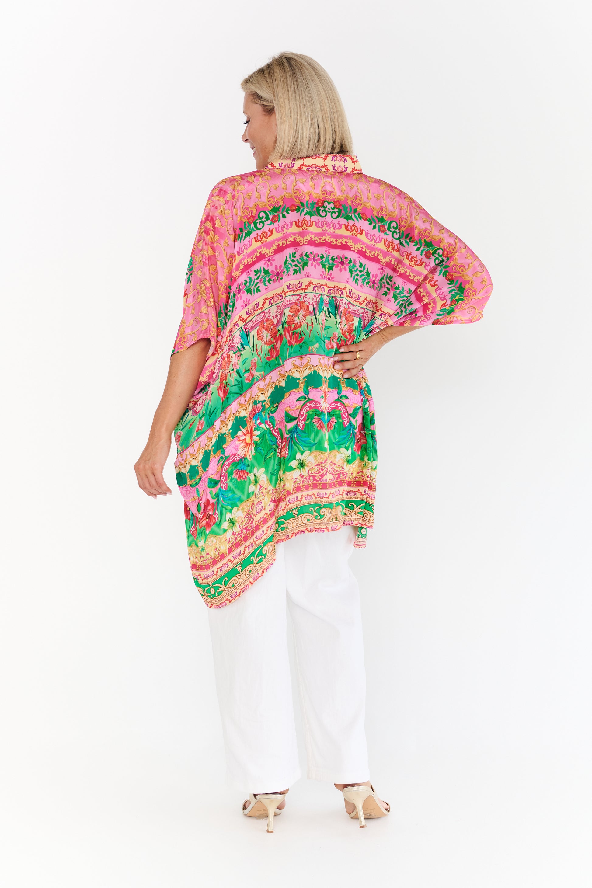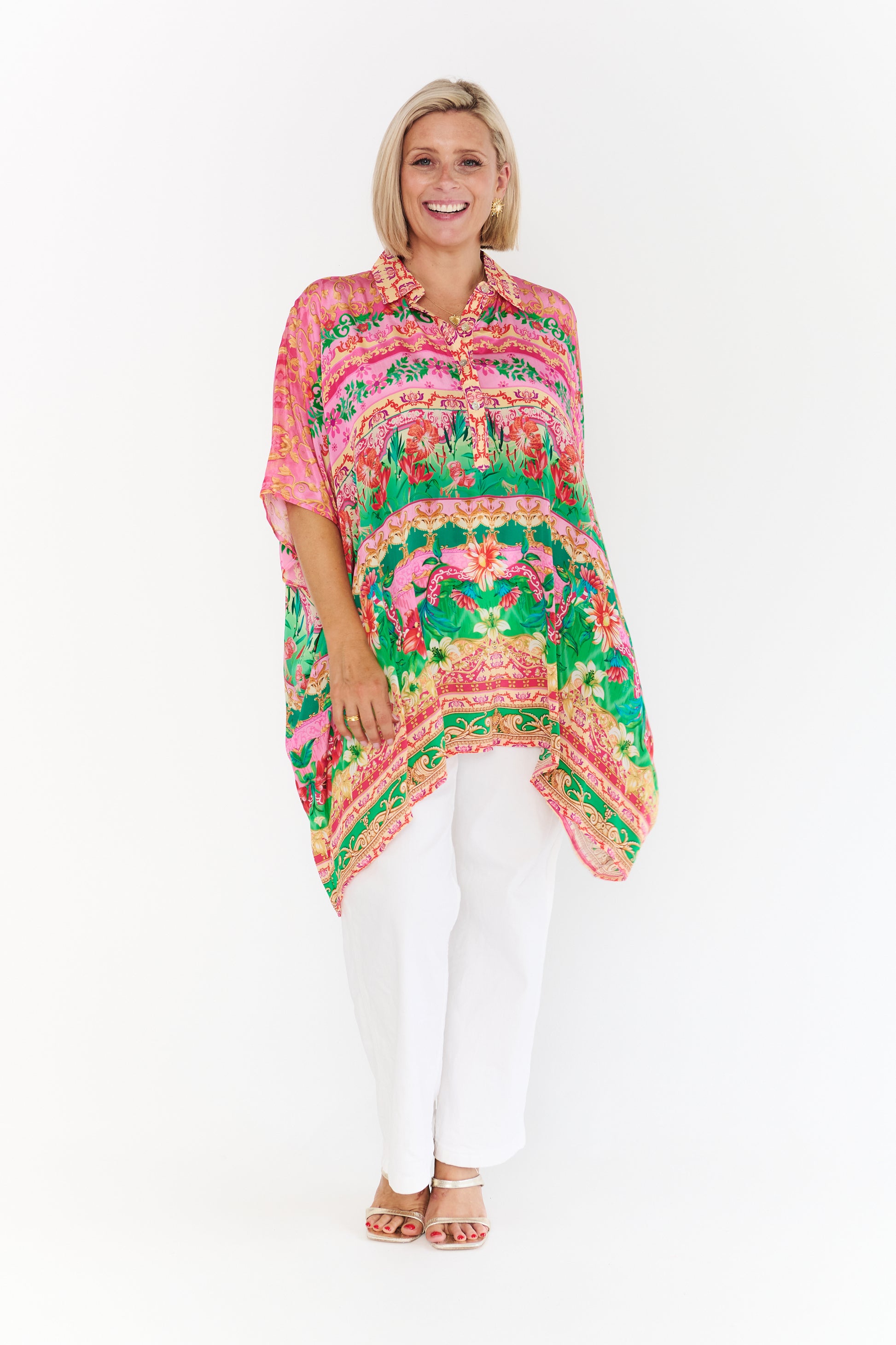 Crafted from premium 100% viscose crepe, this top is celebrated for its luxuriously smooth texture and lightweight, travel-friendly nature. The vibrant print features a lush landscape of hot pink and emerald green botanicals, set against ornate golden filigree that captures a sun-soaked, Mediterranean aesthetic.
