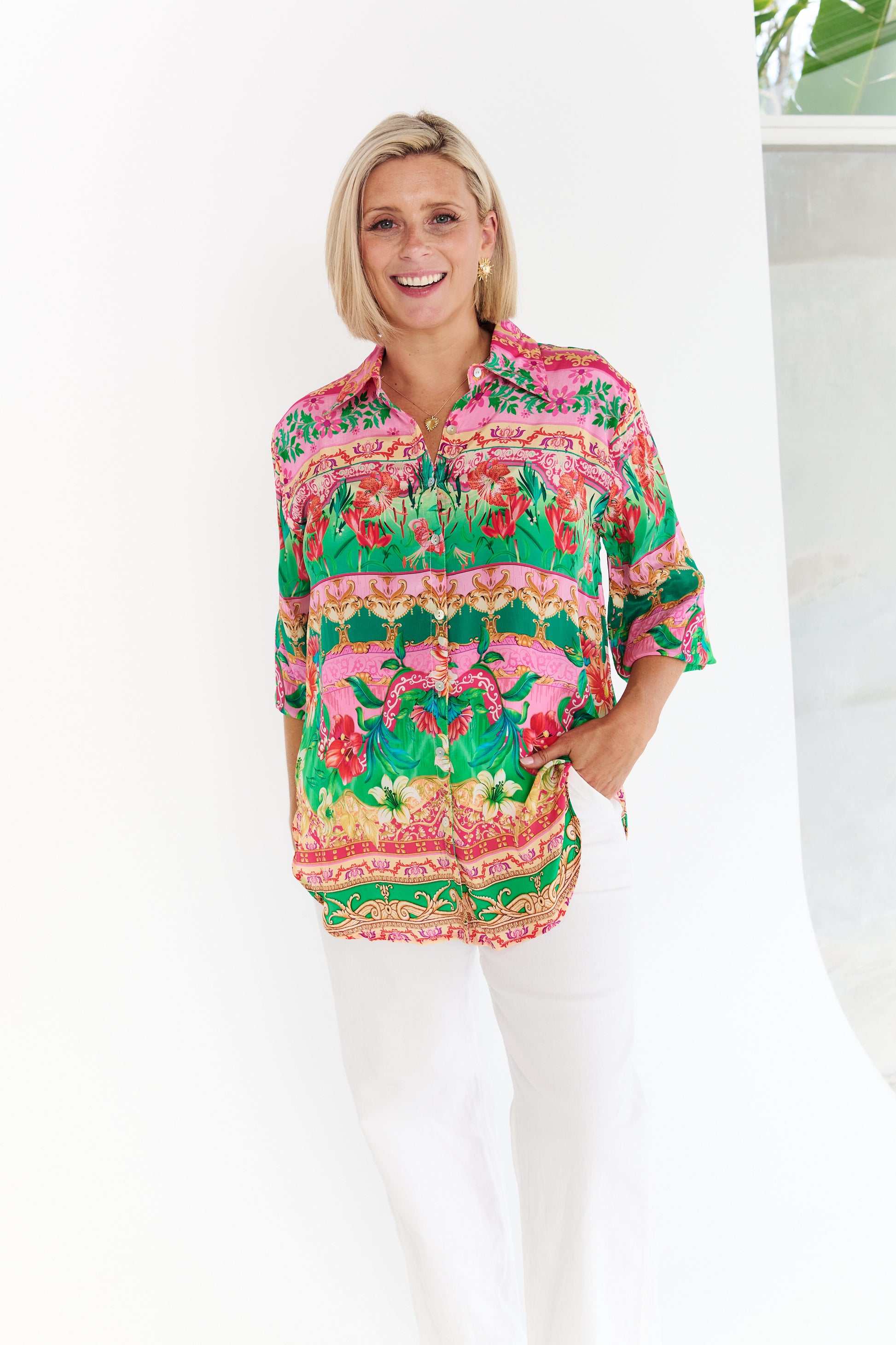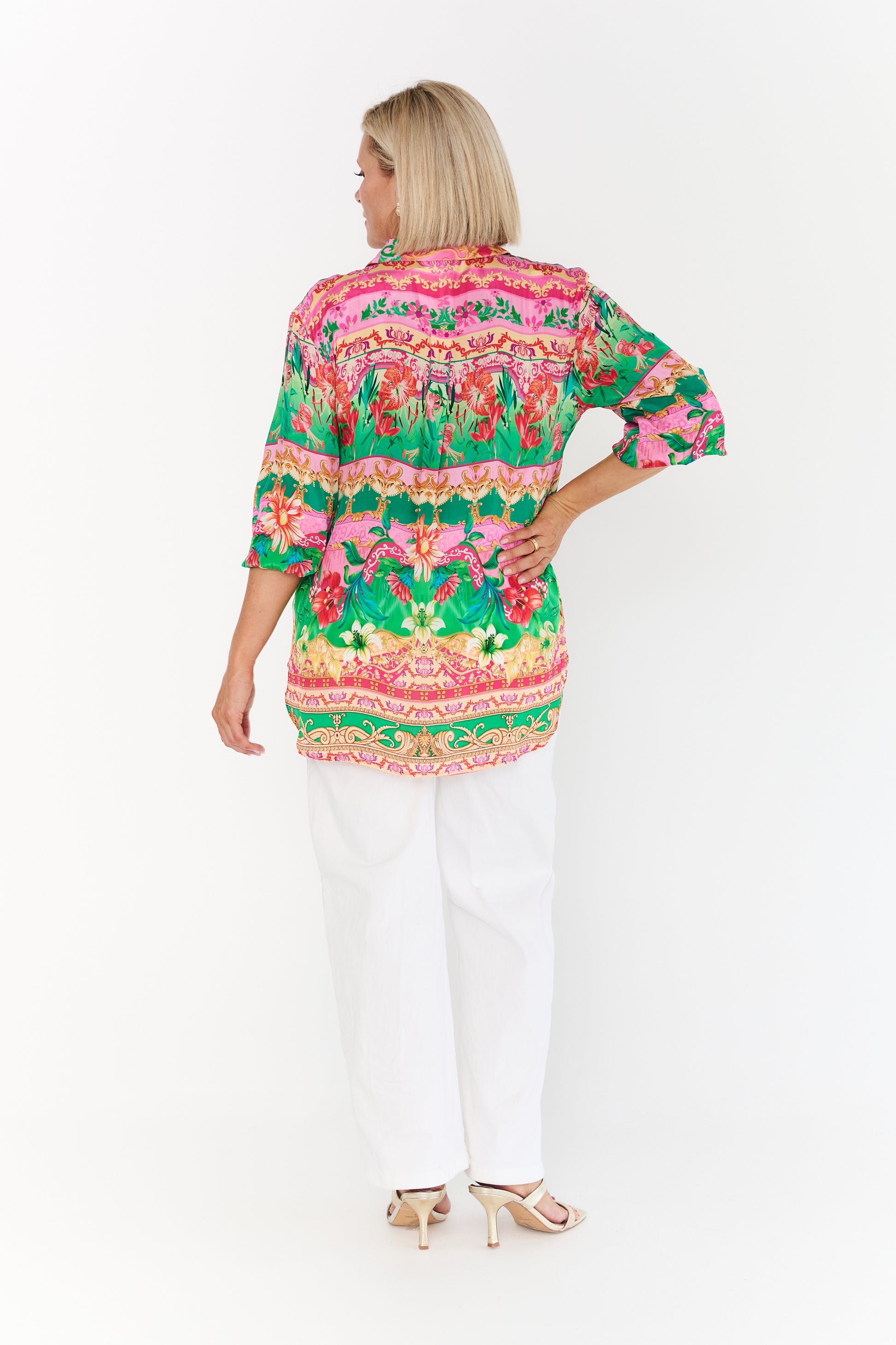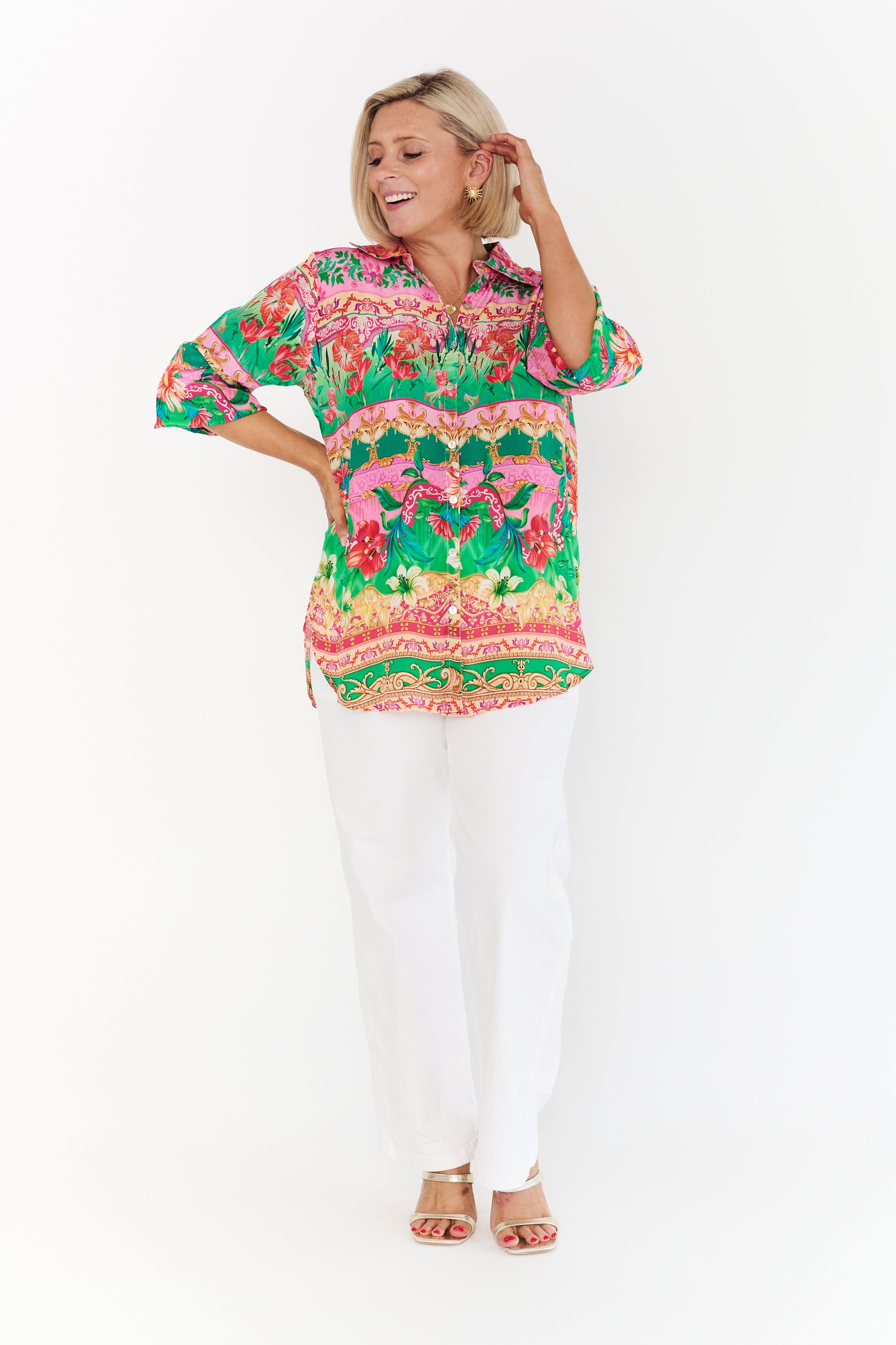 Featuring a timeless button-through design and classic collar, it offers a polished yet relaxed silhouette that flatters while allowing ease of movement. The gently curved hem enhances versatility, making it ideal for styling loose, half-tucked, or fully tucked depending on the occasion.