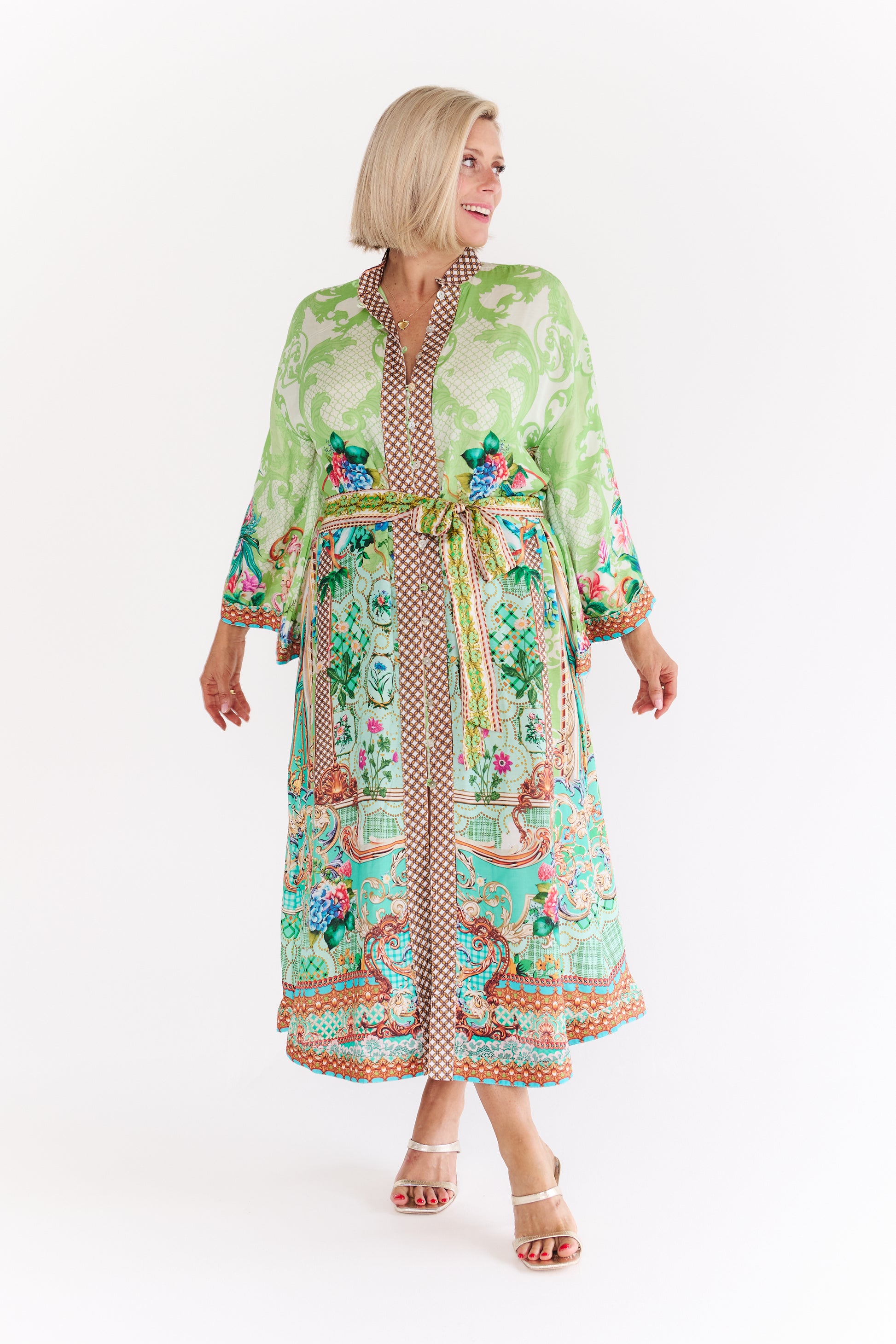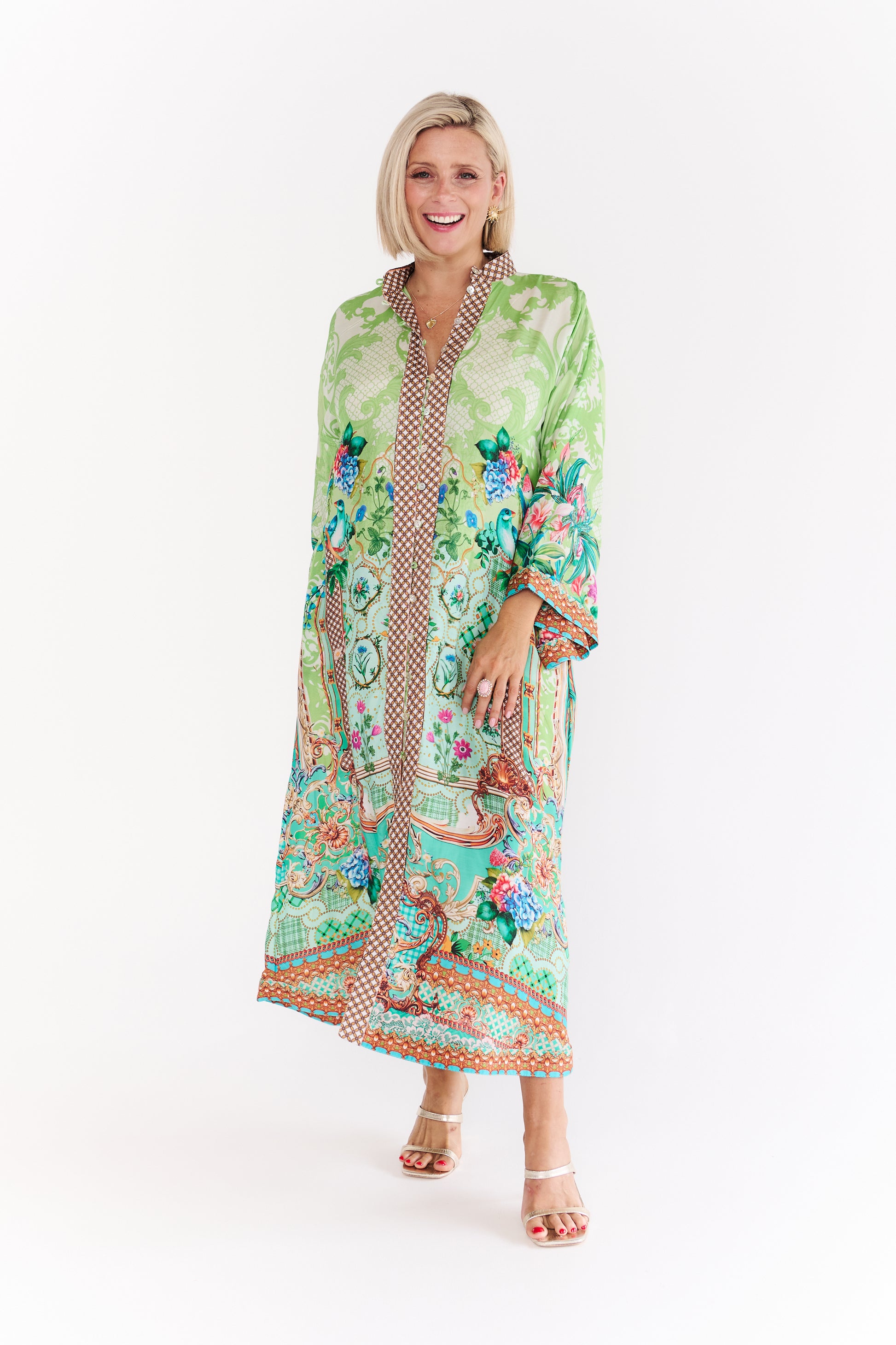 The print is a maximalist’s dream: a rhythmic collision of checkerboard borders, tropical flora, and neo-baroque scrolls in electric greens and deep teals. It’s a visual narrative that ensures no two glances at the dress are ever the same, making it a definitive conversation starter.