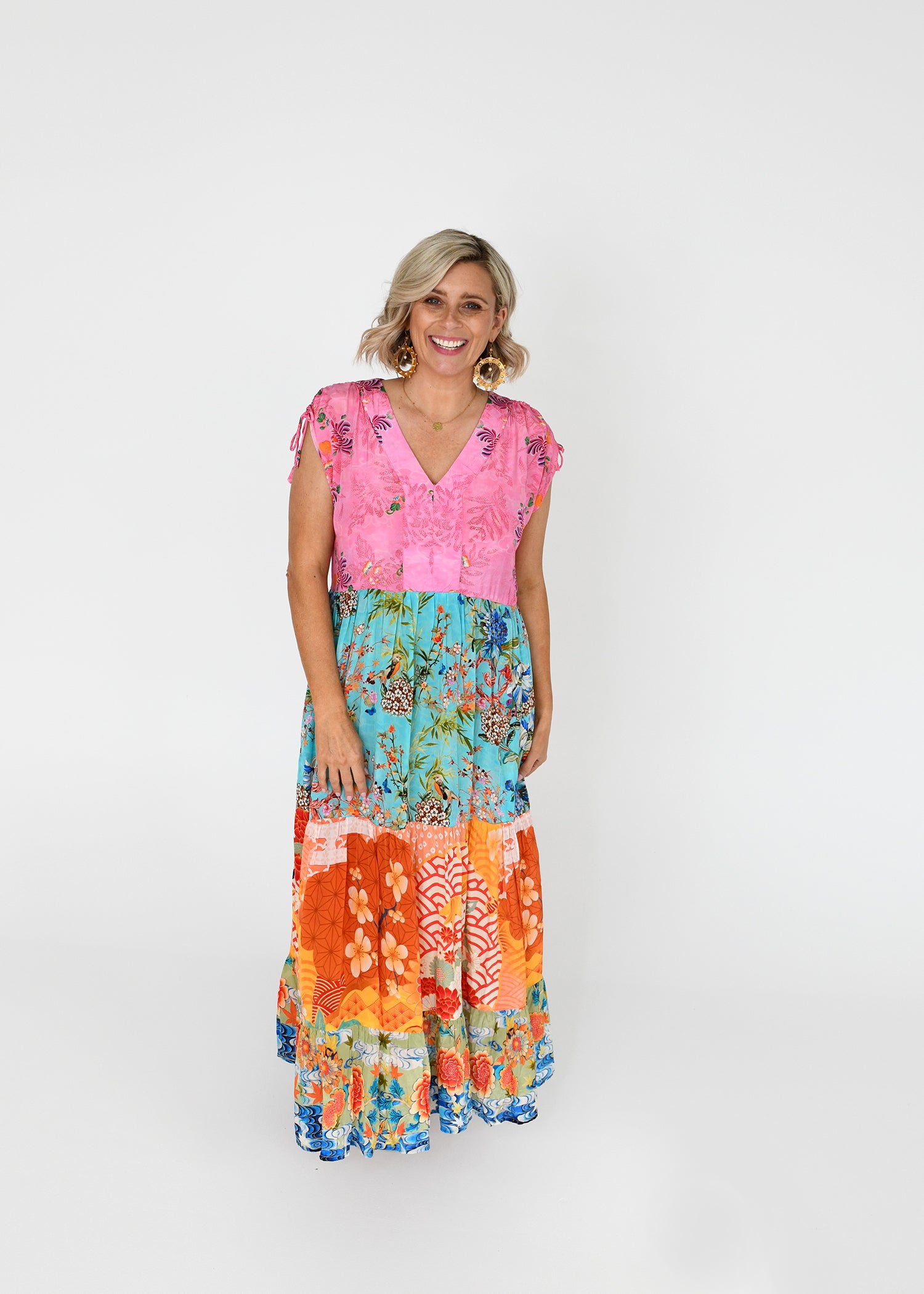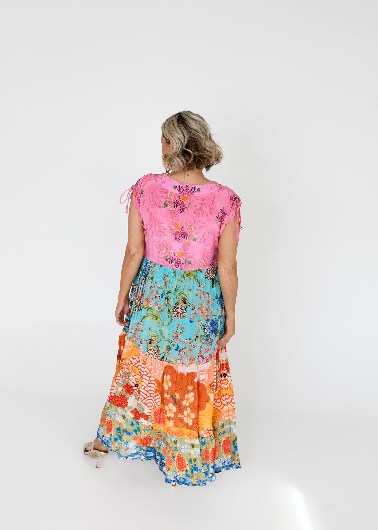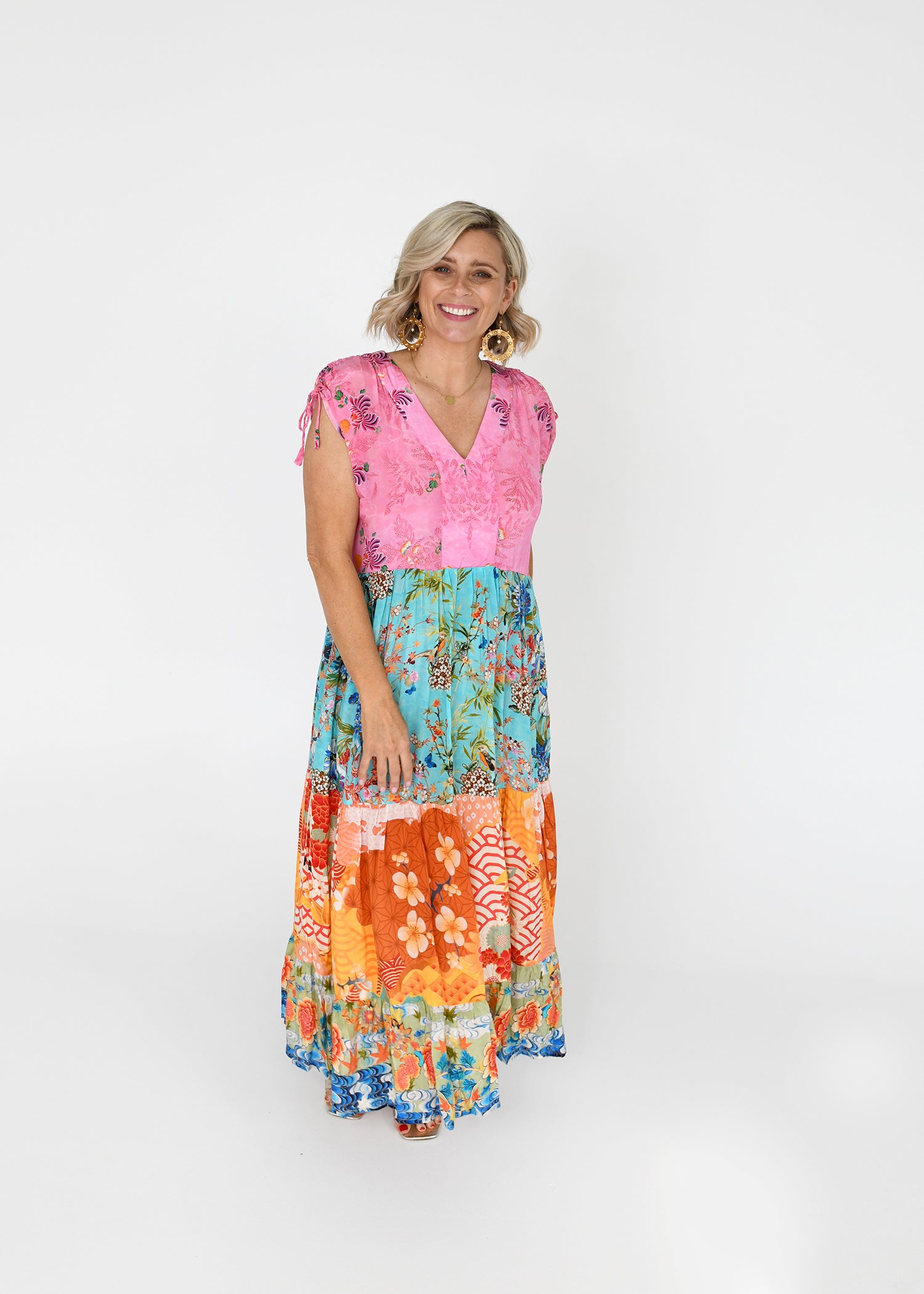 A soft, feminine silhouette, tiered maxi dress blends tropical florals, patchwork prints, and a flattering V-neckline that’s both playful and polished. This standout piece features a soft pink bodice adorned with delicate floral embroidery and playful shoulder ties, flowing into a full-length skirt crafted from vibrant, contrasting panels.
