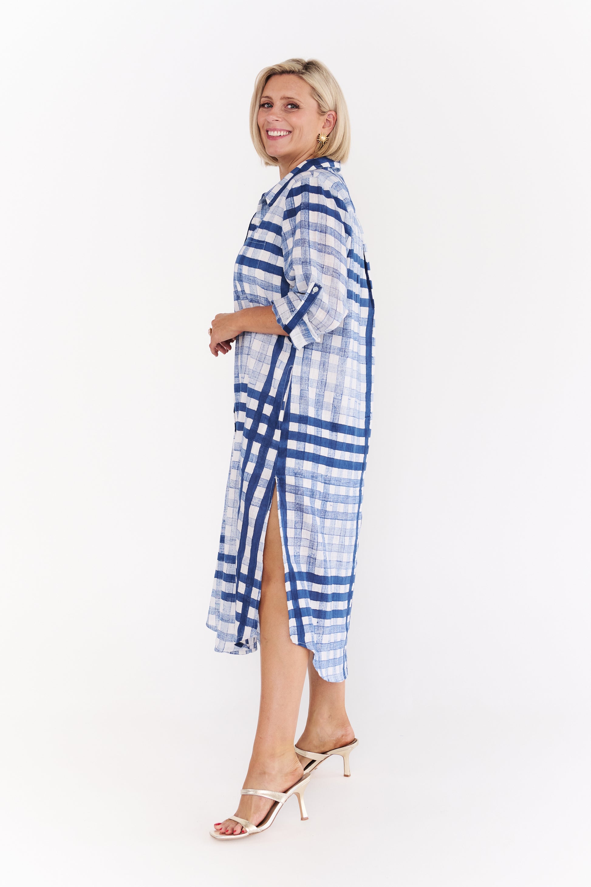 This dress is a relaxed, mid-calf button-down made from a soft blue and white plaid fabric that evokes a sense of casual ease and timeless charm.