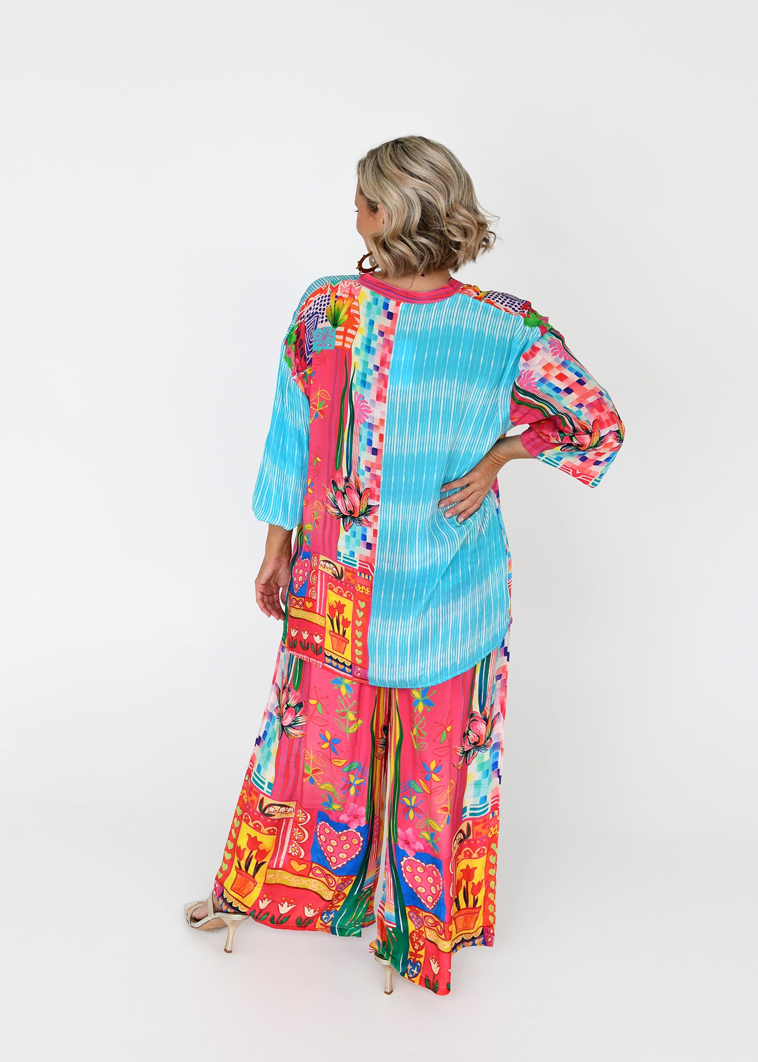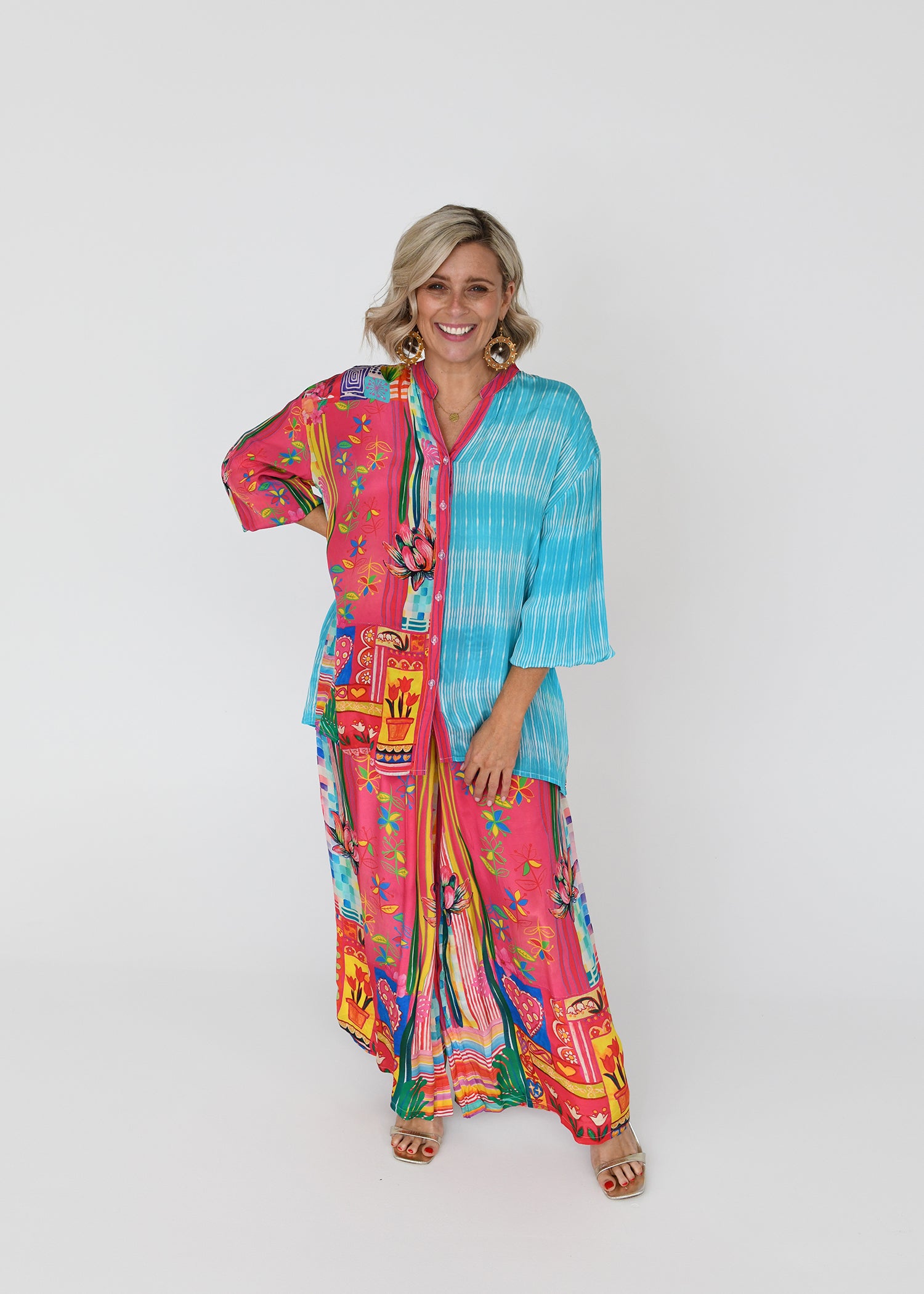 The Mave Set is a joyful, art-inspired ensemble that’s as comfortable as it is eye-catching. A perfectly paired combo featuring a relaxed-fit button-down shirt and wide-leg flowy pants.