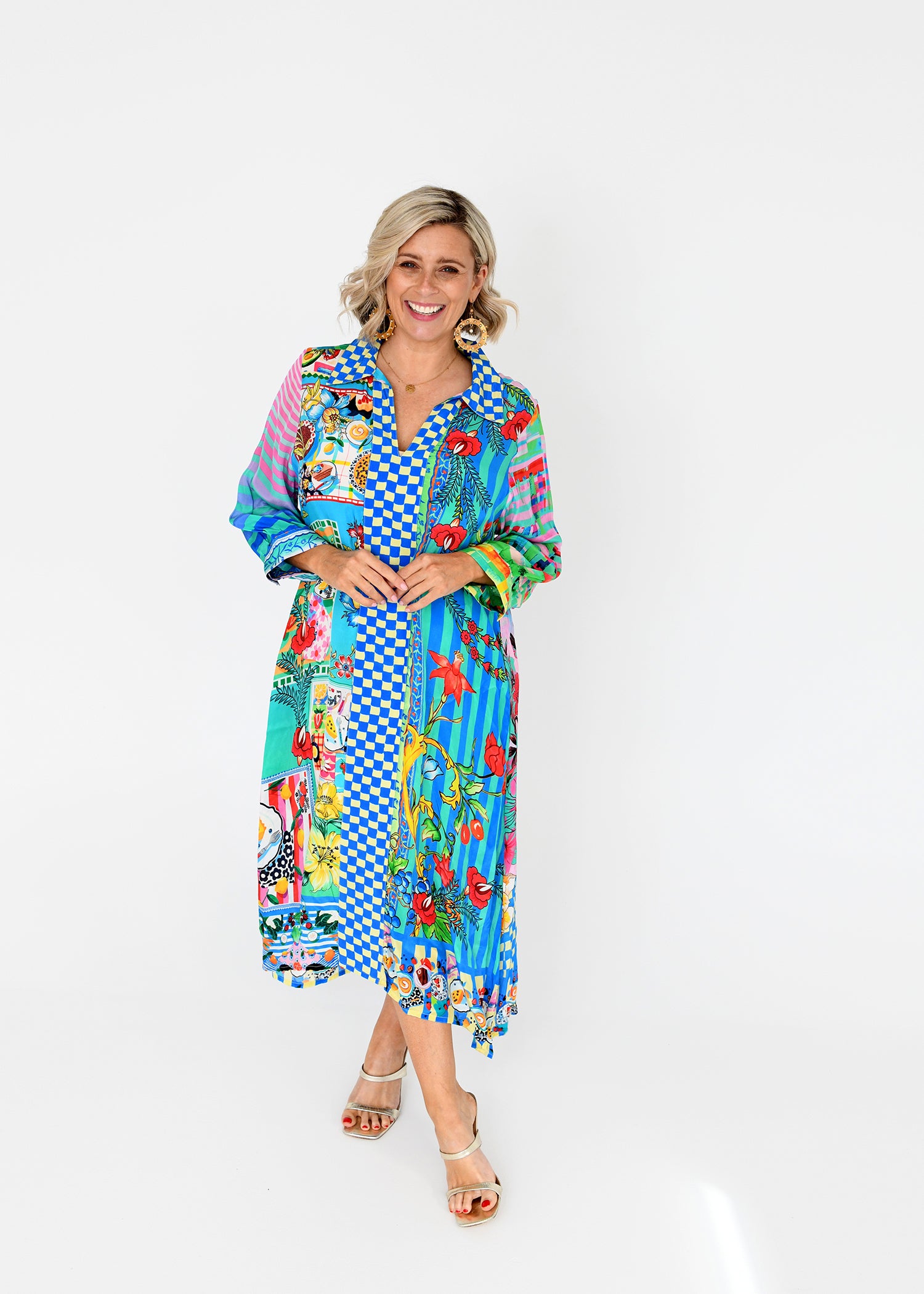 Turn heads in this vibrant, statement dress which features a bold patchwork of checkerboard patterns, florals, fruits and playful motifs in electric blues, zesty citrus and vivid reds.