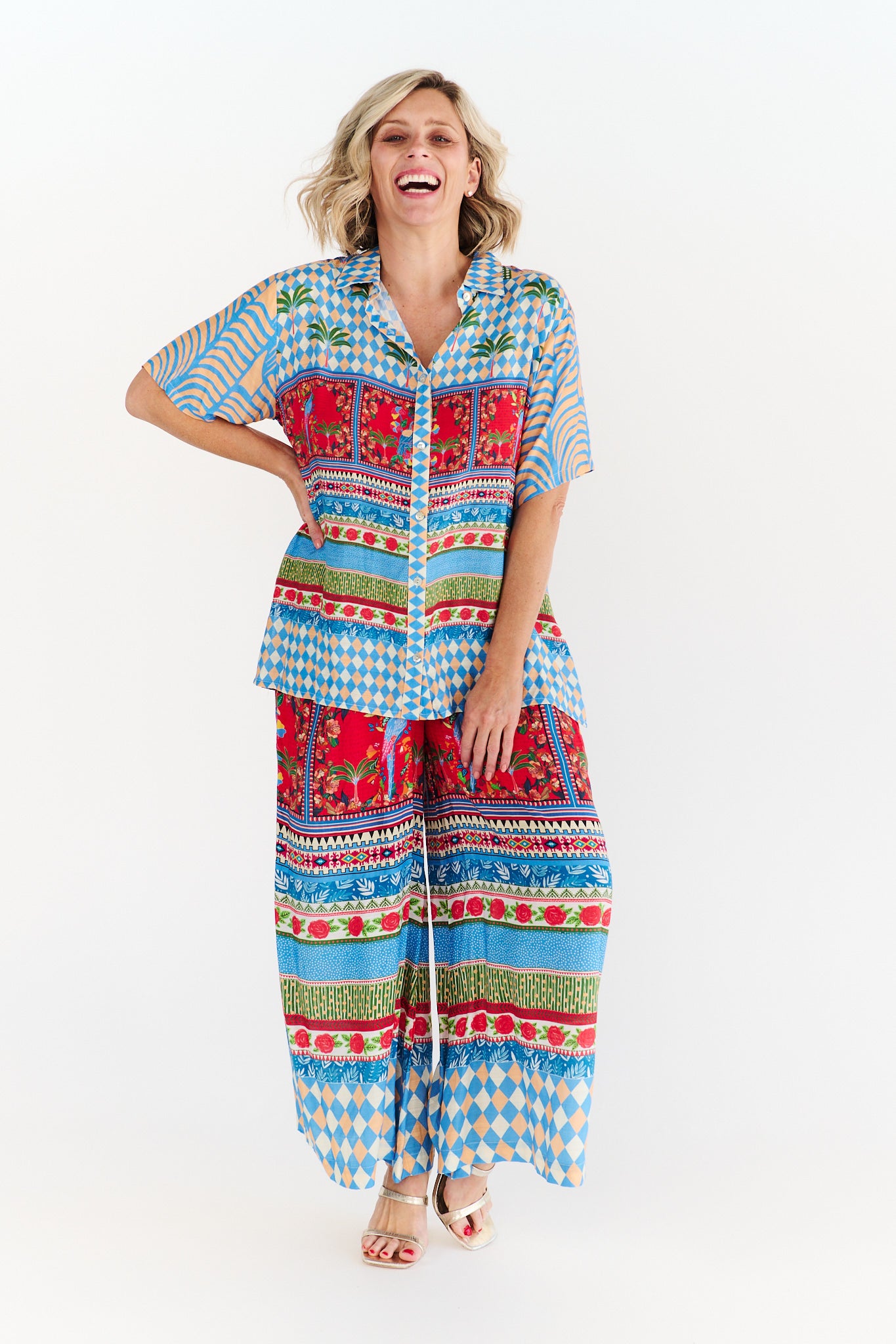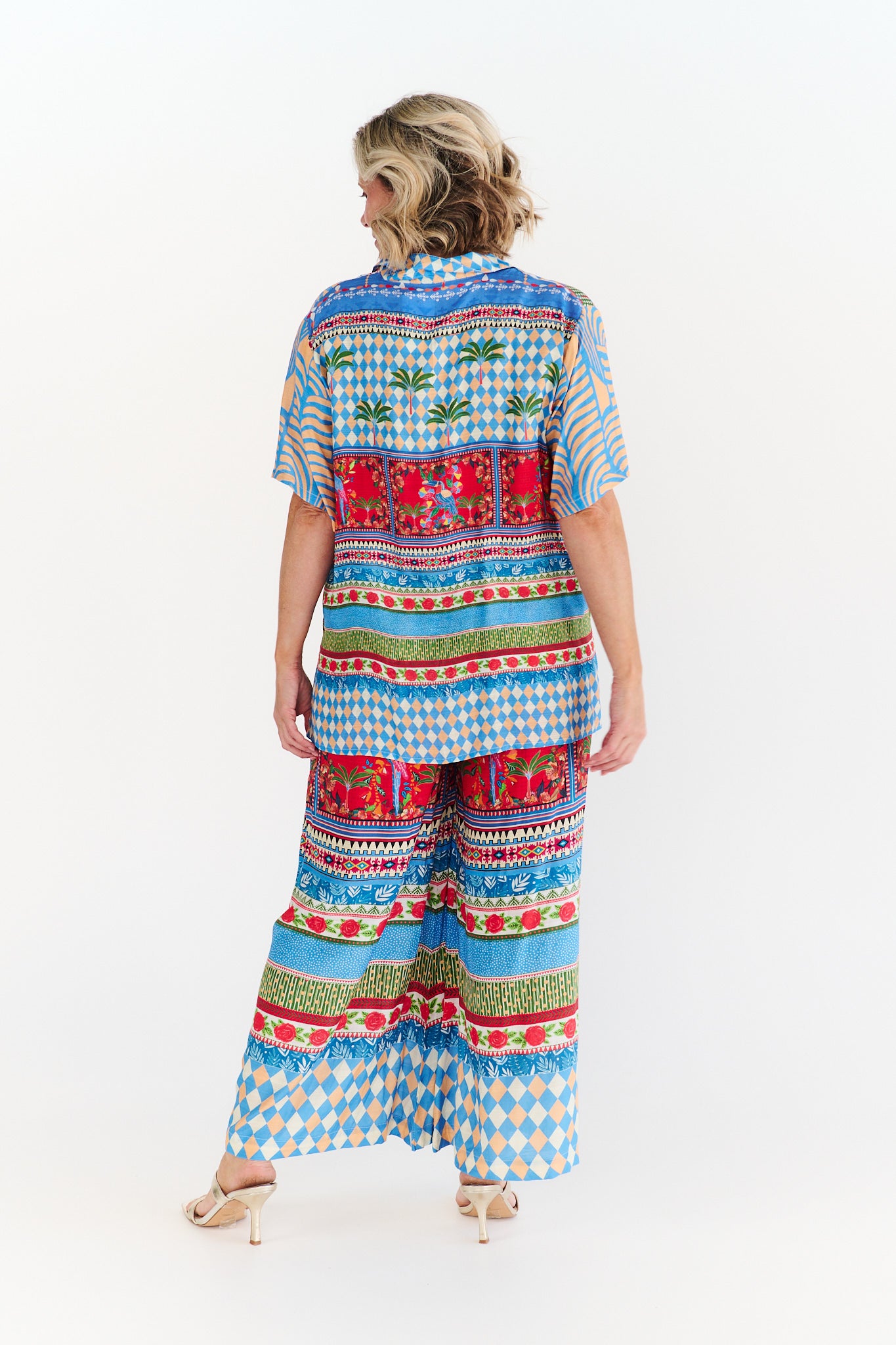 The two-piece pant suit blends playful patterns with vibrant, Mediterranean-inspired colours and consists of a short-sleeved button-up shirt and wide-leg pants.